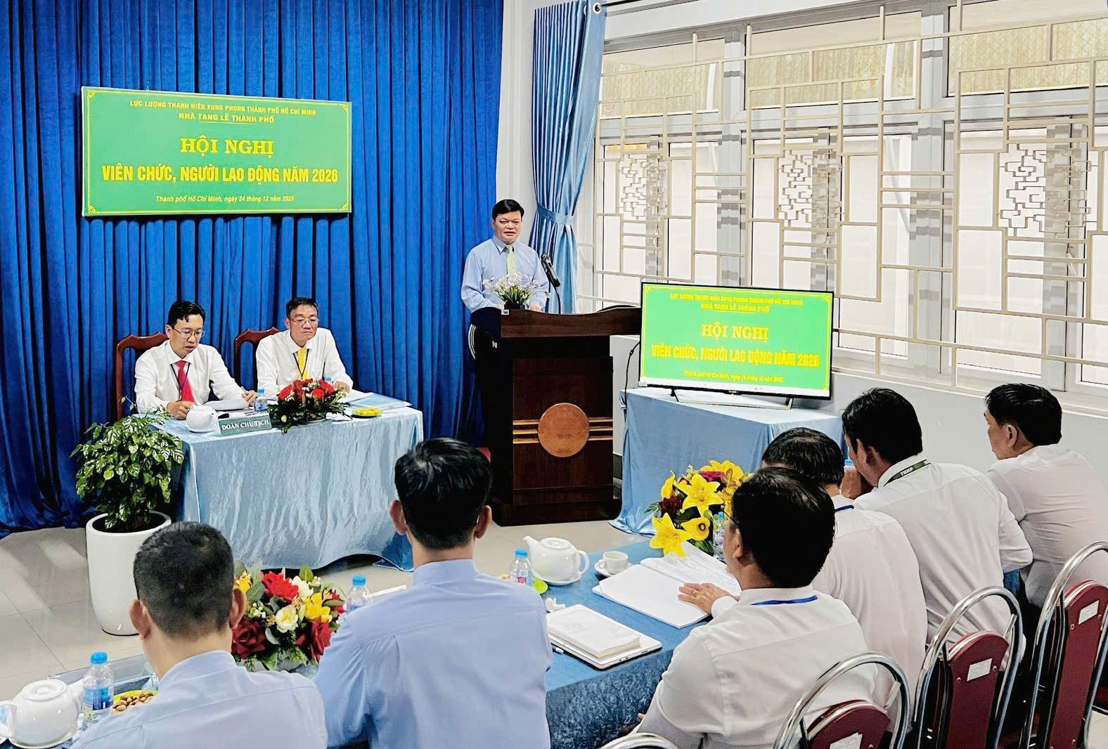 Chiều ngày 24/12/2025, Nhà Tang Lễ Thành Phố đã tổ chức Hội nghị viên chức, người lao động năm 2026. Tham dự Hội nghị có đồng chí Đỗ Hữu Chính – Phó Bí thư Đảng ủy, Phó Chỉ huy trưởng Lực lượng TNXP Thành phố; đại diện lãnh đạo Phòng Công tác Chính trị, Phòng Tổ chức Lực lượng TNXP Thành phố; Ban giám đốc, cùng toàn thể viên chức, người lao động của đơn vị.